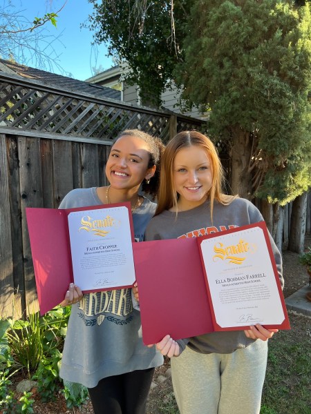 Two Menlo-Atherton High School juniors — Faith Cropper (left in photo) and Ella Bohmann Farrell — recently received the Jefferson Award for community service for founding the Care Bears Club on campus, which now has about 50 student members.