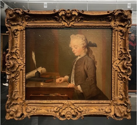 Despite his muted palette, Chardin does not lack vitality. From across the room, the painting’s quiet force draws you in; up close, it rewards sustained looking through its delicate dialogue of light and shadow. Auguste Gabriel’s knuckles are gently illuminated, reflecting softly on the tabletop. The spinning top and the pen poking out of the desk drawer echo each other’s shadows. Chardin deepens our engagement by working the edges of the canvas, as the bottom of the drawer and the white scroll disappear beyond the frame. Though the boy is ostensibly the painting’s subject, the true theater occurs in this lower-left quadrant – a compact scene of motion, reflection, and quiet revelation.