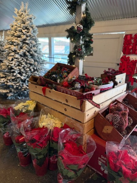 Holiday decor includes fresh garlands and wreaths and assorted poinsettias