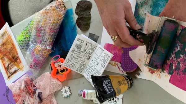 Teaching artist Raine Robichaud will explain how to create textures and layers with gelli plates and household and natural materials. The gelli plates we will be using do not contain any animal products and are nontoxic.