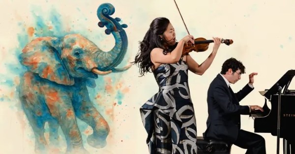 Credit is due to the designer of the image. The watercolor-style elephant—rendered in vivid blues and oranges—features a trunk that subtly transforms into a violin’s scroll and pegbox. This integration is precise rather than decorative, aligning the animal’s form with the instrument’s structure. The effect is particularly apt given the reference to The Carnival of the Animals by Camille Saint-Saëns, where music and animal imagery are already intertwined.